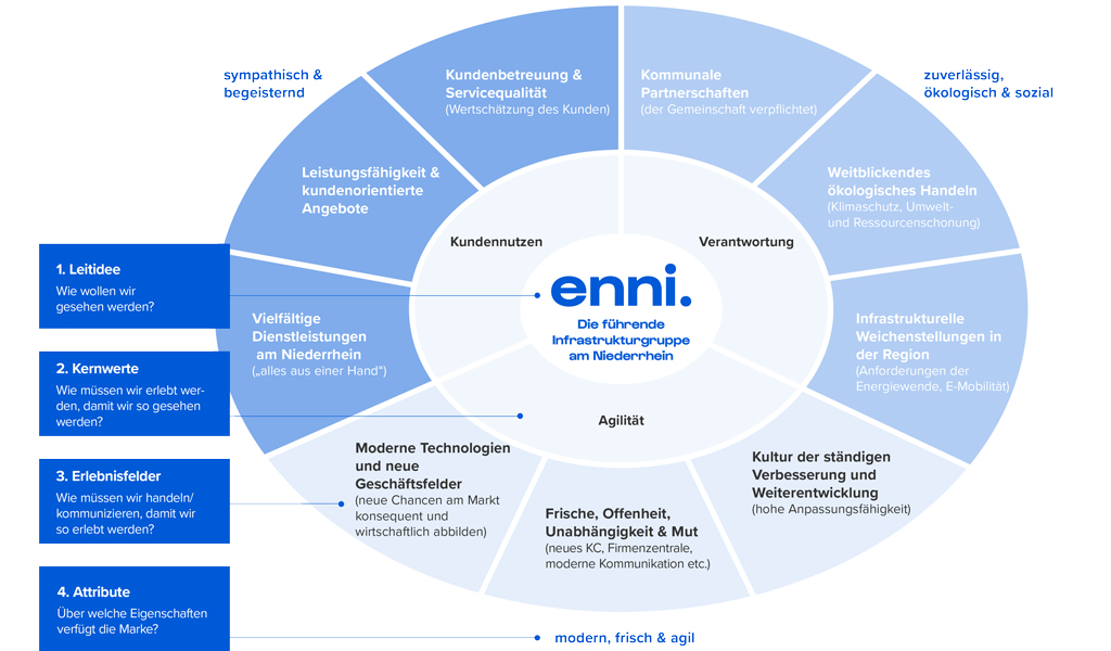 Die Marke Enni wird die neue Strategie der Unternehmensgruppe unterstützen. Das Potential hierzu hat sie sich mit hohen Bekanntheits- und besten Sympathiewerten in zwei Jahrzehnten sukzessive erworben. Gestartet als reine Energiemarke im Zuge der seinerzeit viel beachteten Fusion der Stadtwerke Moers und Neukirchen-Vluyn zu einem gemeinsamen interkommunalen Stadtwerk zu Beginn des Jahrtausends, ist sie erwachsen geworden und seit 2011 das gemeinsame Markendach für alle energiewirtschaftlichen und Infrastrukturangebote der drei heutigen Gruppenunternehmen. Im dritten Markenjahrzehnt hat Enni sie behutsam angepasst. Die neue Enni wird die neue Strategie der Unternehmensgruppe im neuen, einheitlichen Markendesign widerspiegeln.