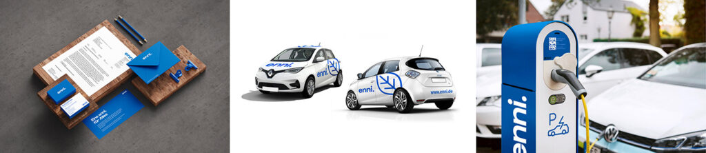 Optisch zeigt die klare gestalterische Linie der relaunchten Enni den konsequenten Zusammenschluss der drei Gruppenunternehmen. Die bisher noch vorhandenen farblichen Unterschiede der jeweiligen Unternehmen sind verschwunden. Die neue Primärfarbe ist eine Weiterentwicklung des bisherigen Enni-Blaus, dabei leuchtender, heller und brillanter. Die Marke konzentriert sich dabei auf das Wesentliche – die Enni. Die neue Kleinschreibung des Logos überträgt die Ambition der Agilität und Dynamik der Enni und ist ein optisches Statement. Der Punkt hinter dem Namen setzt einen Akzent, der Haltung zeigt. Stilistisch und grafisch ist das klare und reduzierte Logo der Enni samt dem vereinfachten Claim „leichter leben“ ein Ausdruck für Frische, Unabhängigkeit und Mut. Und der hat die Entwicklung zur heutigen Unternehmensgruppe ja schon immer maßgeblich geprägt.